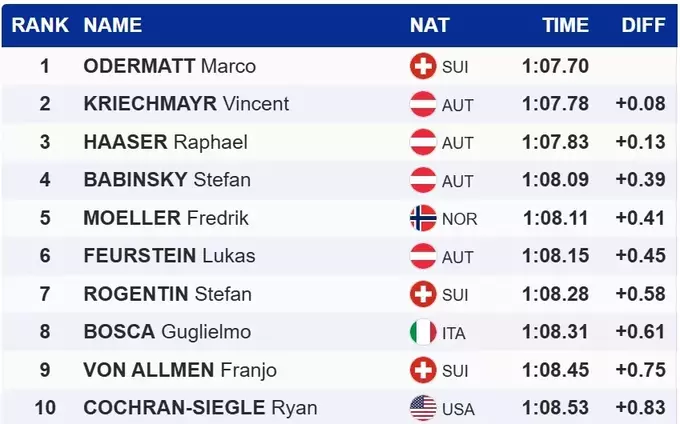 Швейцарец Марко Одерматт опередил второе место на 0.08 секунды и стал победителем супергиганта с общим временем 1:07.70.