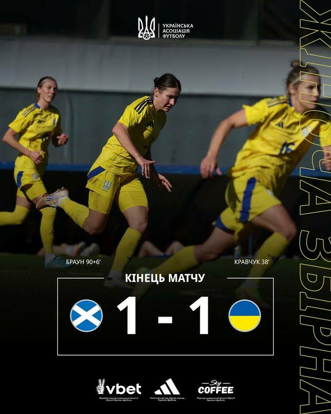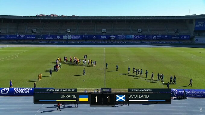 После перерыва Шотландия пыталась отыграться, но защита сине-желтых до последних секунд играла надежно. Однако на 90+6 мин Мария Маканени протолкнула мяч в ворота украинской команды (1:1).