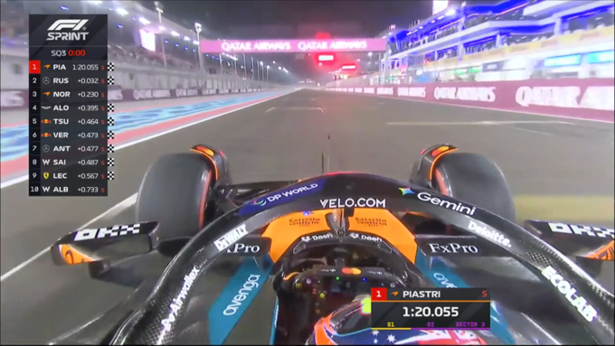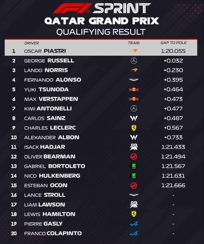 Состоялась спринт-квалификация в рамках гран-при Формулы-1 в Катаре. Спринт-поул завоевал пилот Макларена Оскар Пиастри, который опередил Джорджа Расселла на Мерседесе и напарника Ландо Норриса.