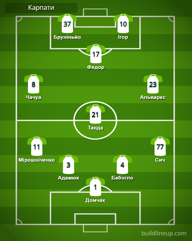 «Карпаты»: Домчак – Мирошниченко, Адамюк (Педрозу, 54), Бабогло, Сыч – Танда – Чачуа (Фаби, 90+2), Альварес – Федор (Карабин, 72) – Бруниньо, Игор (Краснопир, 72).