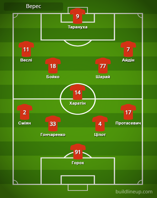 «Верес»: Горох – Смиан, Гончаренко, Ципот, Протасевич – Бойко (Клец, 86), Харатин, Шарай (Куция, 90+4) – Уэсли (Корнийчук, 75), Тарануха (Ндукве, 86), Айдин (Годя, 75).