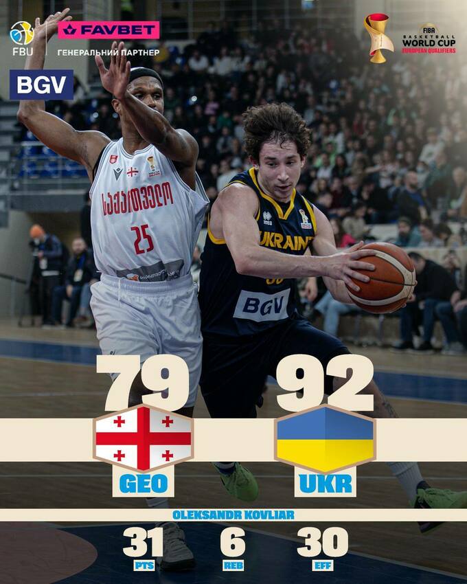Мужская сборная Украины по баскетболу одержала победу на выезде над Грузией (четвертьфиналистом Евробаскета) со счетом 92:79 в стартовом матче основного раунда квалификации на ЧМ-2027.