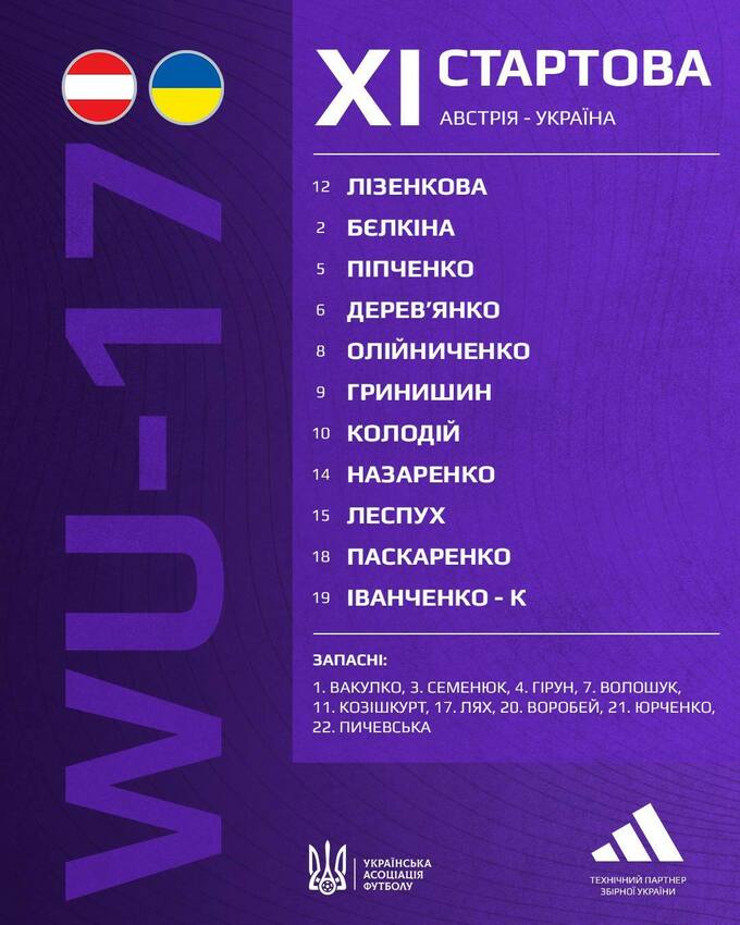 Украина (WU-17): Лизенкова (Вакулко, 45+2), Олейниченко, Белкина, Деревянко (Гирун, 81), Пипченко, Гринишин, Колодий, Назаренко (Козишкурт, 65), Иванченко (к) (Пичевская, 85), Паскаренко (Воробей, 65), Леспух