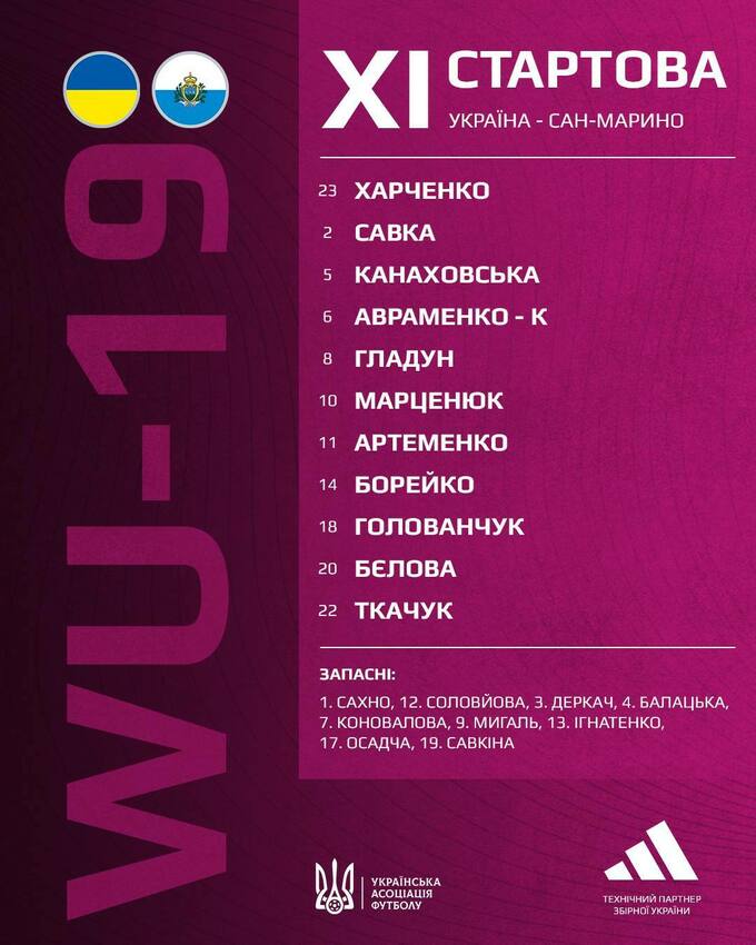 Украина WU-19: Харченко, Борейко, Савка, Авраменко (к), Гладун, Ткачук, Артеменко, Голованчук, Марценюк (Коновалова, 46, Балацкая, 87), Белова, Канаховская.