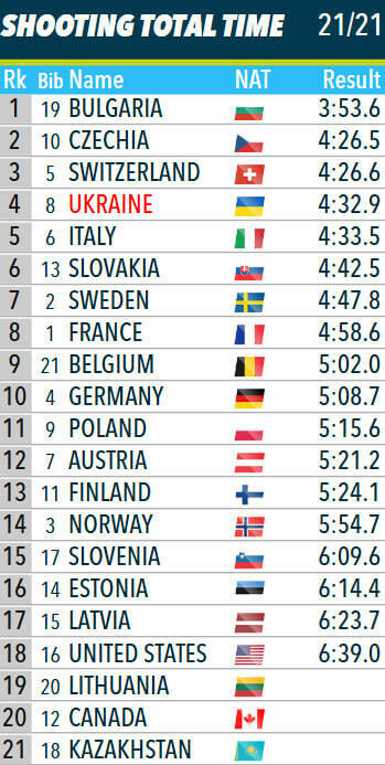 По итогам гонки украинская команда финишировала на 15-м месте, продемонстрировав скорость стрельбы – четвертый результат среди всех команд (4:32.9).