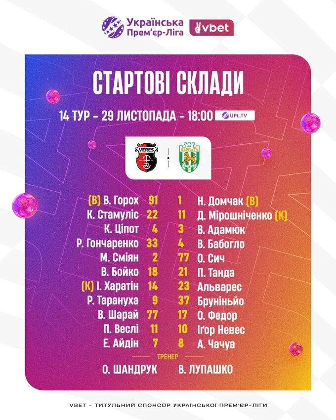 В матче 14-го тура Украинской Премьер-лиги 2025/26, который состоится 29 ноября, сыграют ровенский «Верес» и львовские «Карпаты».