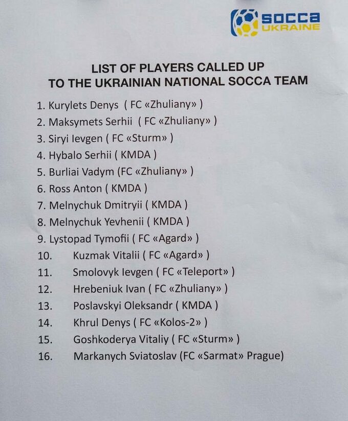 В состав сборной Украины вошли 16 игроков, среди которых известный футзалист Евгений Серый, а также представители профи-футбола из команды Колос-2 – Денис Хруль и Виталий Гошкодеря.