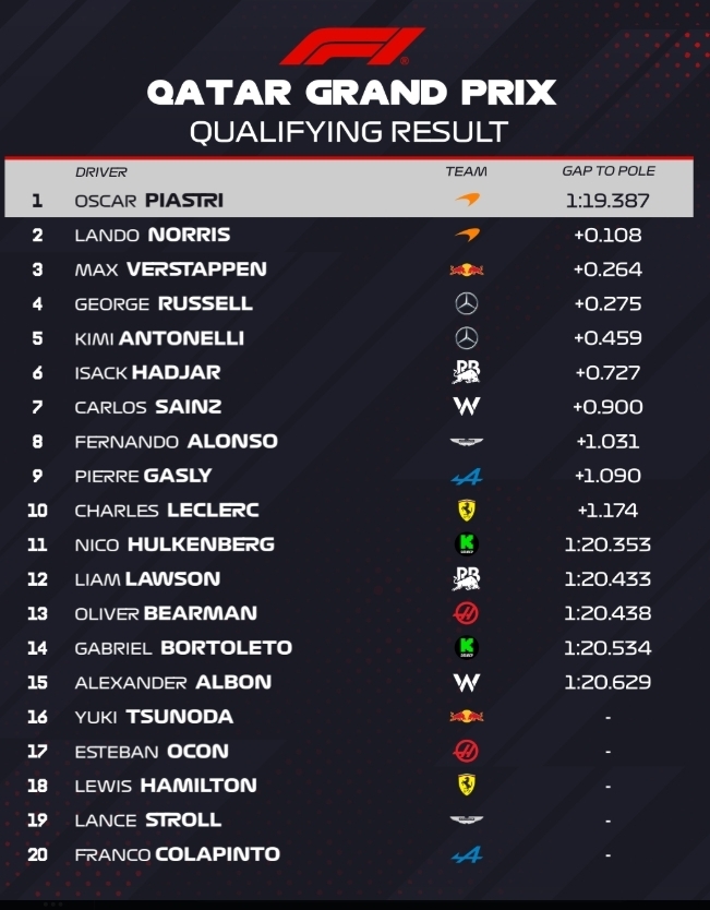 Состоялась квалификация Формулы-1 в рамках Гран-при Бахрейна. Поул завоевал пилот Макларена Оскар Пиастри, который опередил напарника Ландо Норриса на 0,1 секунды.
