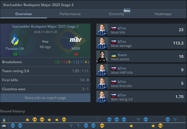 Украинский клуб Passion UA одержал важную победу во втором этапе Budapest Major, обыграв бразильский состав MIBR в формате Bo1. Команды сыграли на карте Mirage, где коллектив украинского футболиста Александра Зинченко победил со счетом 13:10.