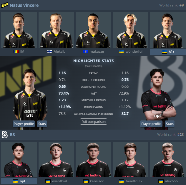 Natus Vincere сейчас занимают 9-е место мирового рейтинга HLTV, тогда как их соперник B8 Esports располагается на 23-й позиции.