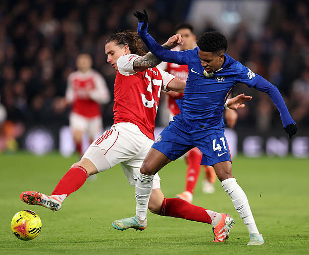 На 38-й минуте Челси остался в меньшинстве. Мойзес Кайседо был удален за жесткий гол, при этом он сам получил травму. Хавбек Челси ударил по ноге полузащитника Арсенала Микеля Мерино. После просмотра VAR рефери показал красную карточку, и Кайседо покинул поле.