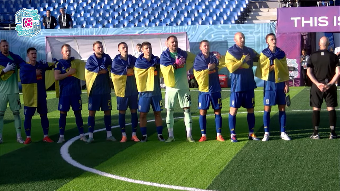 На 9-й минуте голкипер украинцев Александр Пославский открыл счет дальним ударом с центра поля.