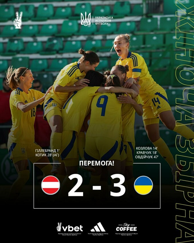 Украинки быстро отыгрались – на 14-й минуте Козлова реализовала передачу Кравчук. Вскоре сине-желая команда вышла вперед: через четыре минуты Кравчук с паса Овдийчук забила второй мяч. Но австрийки еще до перерыва восстановили паритет: Шихтель пробила с линии штрафной, и мяч после рикошета от ноги Котик оказался в сетке.