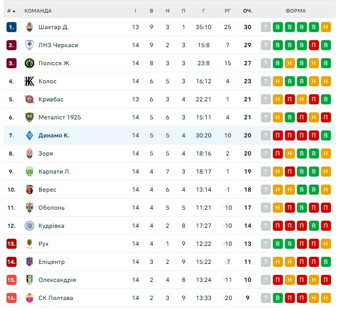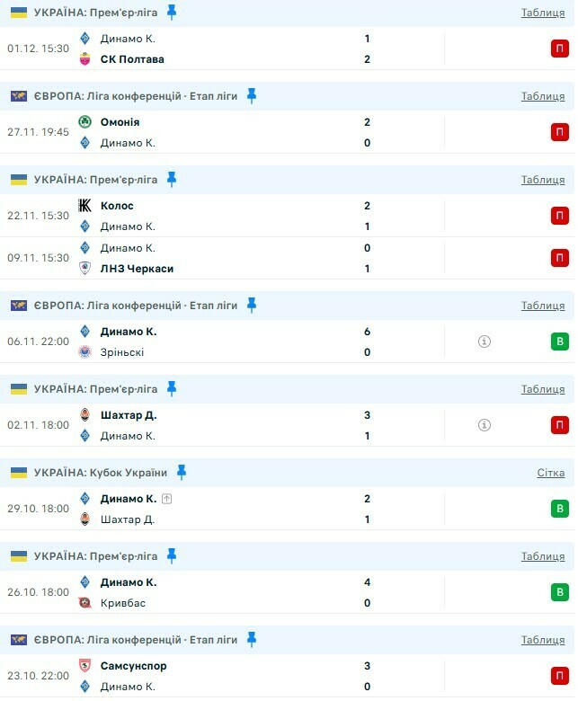 Последовательные поражения Динамо в УПЛ насчитывают уже 4 матча: против Шахтера (1:3), ЛНЗ (0:1), Колоса (1:2), Полтавы (1:2).