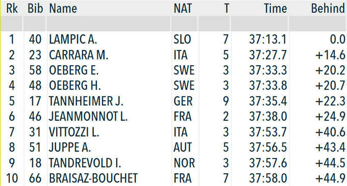 Согласно статистике IBU, на втором месте по скорости на трассе оказалась итальянка Микела Каррара (+14,6), третьей – Эльвира Эберг, которая только вернулась на трассу после болезни (+20,2).