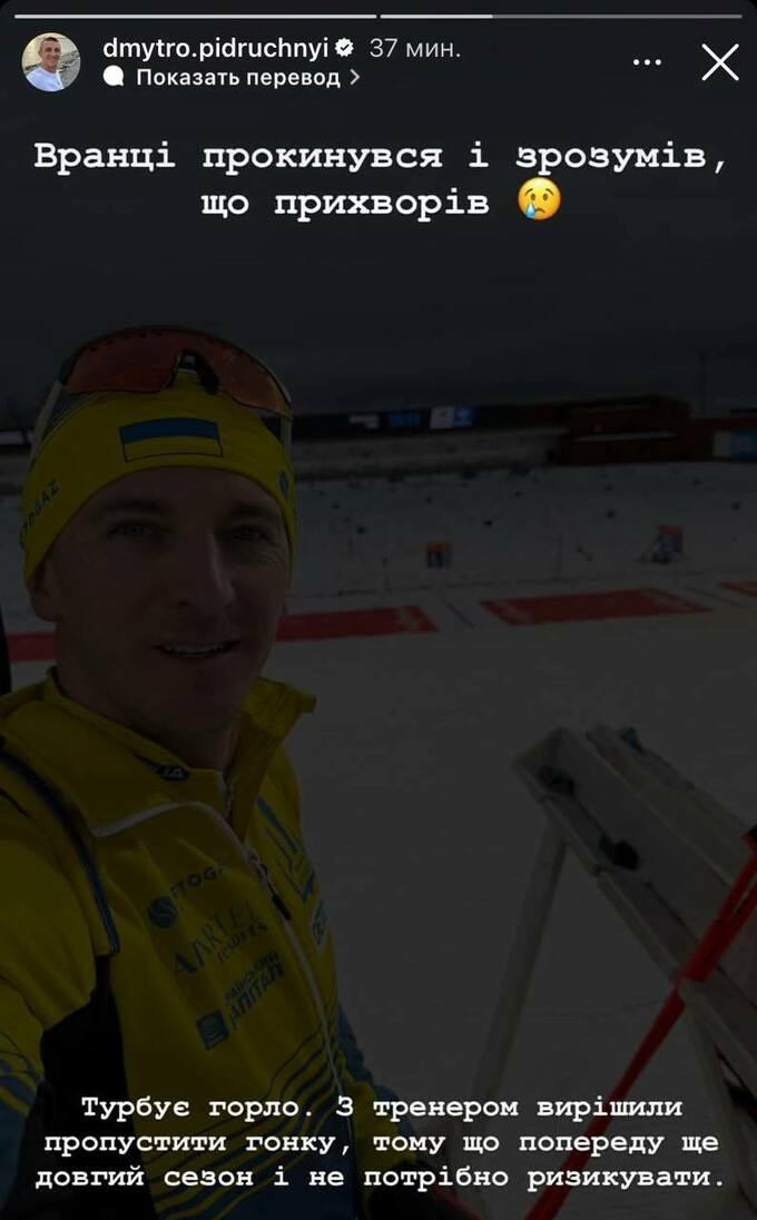 Украинский биатлонист Дмитрий Пидручный пропустит индивидуальную гонку на Кубке мира в Эстерсунде по болезни. Об этом он написал на своей странице в Instagram.