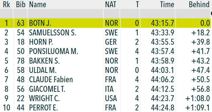 Себастьян Самуэльссон из Швеции, финишировавший третьим, показал второй результат на лыжне. Замкнул тройку в рейтинге немец Филипп Хорн с восьмым результатом индивидуальной гонки.