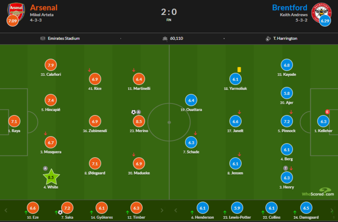 Лучшим игроком встречи был признан Бен Уайт – его действия, в том числе ассист, оценили в 8.5 балла.