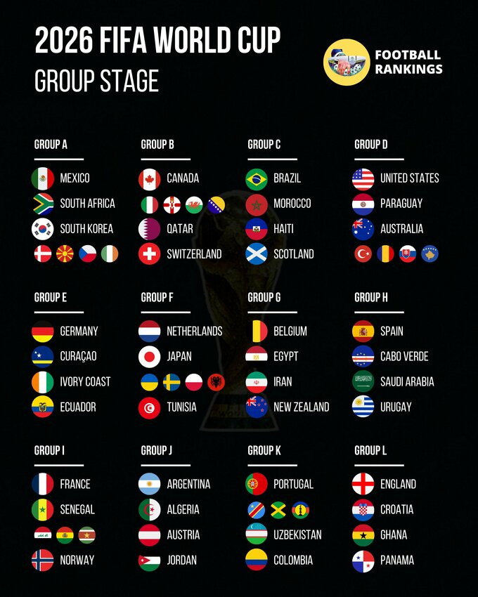 • 🔹 Группа K: Португалия, Плей-офф 1, Узбекистан, Колумбия