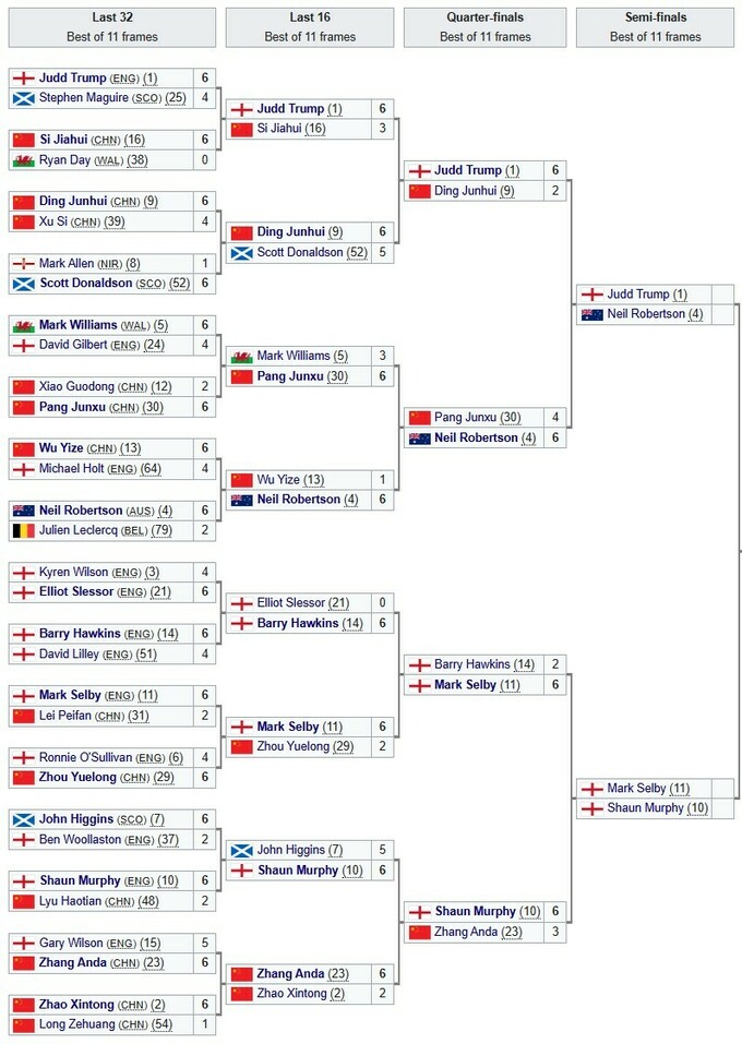 Полуфиналы: Джадд Трамп – Нил Робертсон, Марк Селби – Шон Мерфи