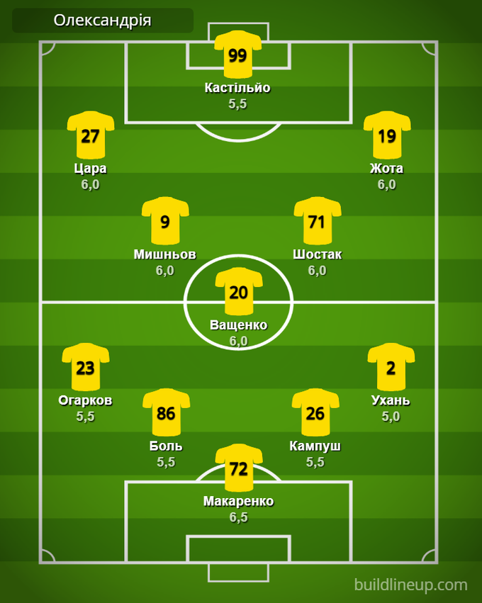 «Александрия»: Макаренко – Огарков (Прокопенко, 84), Боль, Кампуш, Ухань – Мишнев (Фернандо, 84), Ващенко, Шостак (Булеца, 60) – Цара, Кастильо, Жота (Хуссейн, 60).