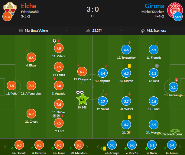 Оценки WhoScored за матч Эльче – Жирона (3:0)