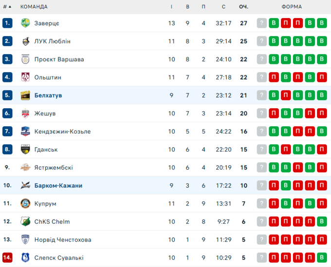 Перед стартом матча «Барком-Кажаны» занимают 10-е место в турнирной таблице, тогда как «Белхатув», имея на четыре победы больше, располагается на 5-й строчке.