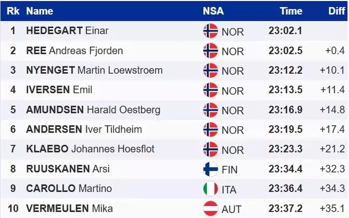 Вторым финишировал Андреас Фьорден Рее, которому буквально 0.4 секунды не хватило до победы. Третье место занял Мартин Левстрем Ньенгет.