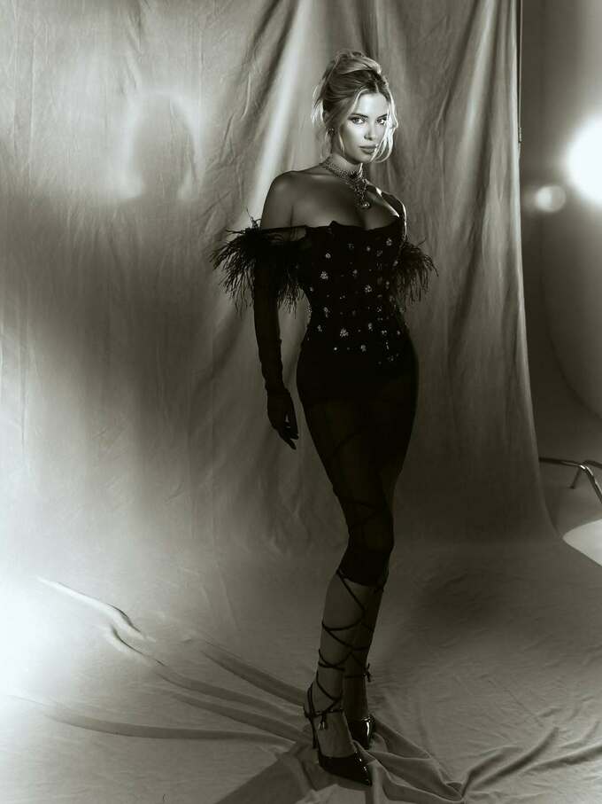 На фото Дария позирует в эффектном черном наряде с перьями и декоративными элементами, подчеркивающими ее фигуру и создающими образ максимально сексуальной дивы.