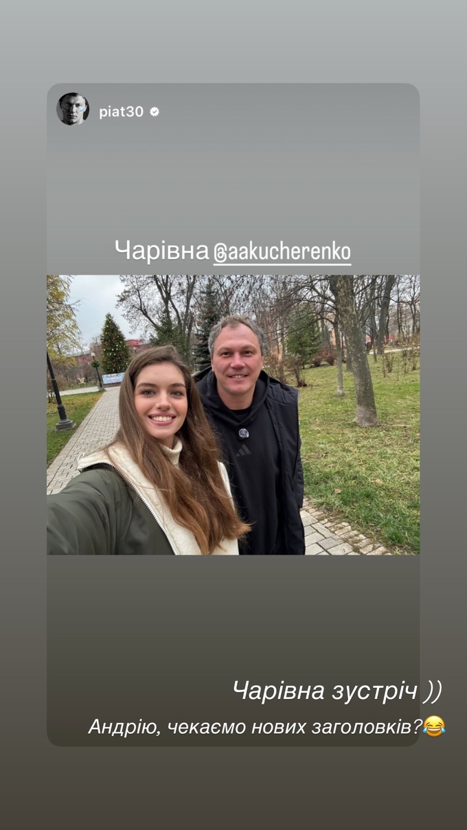Кучеренко подписала снимок шутливой фразой: «Чудесная встреча. Андрей, ждем новых заголовков?», намекнув на возможный инфоповод или новый проект.