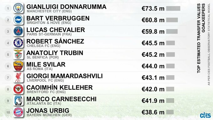 Возглавил рейтинг итальянец Джанлуиджи Доннарумма, за которым расположились нидерландец Барт Вербрюгген, француз Люка Шевалье и испанец Роберт Санчес. Трубин оказался на пятом месте. Стоимость украинца оценивается в 45,2 млн евро.