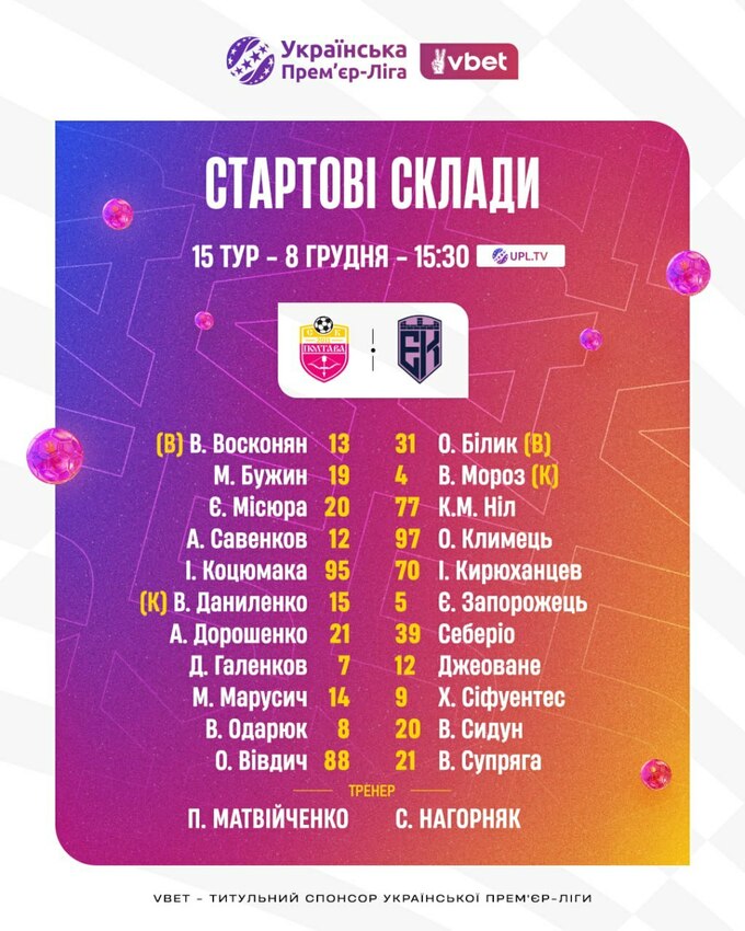 Главные тренера команд Полтава и Эпицентр – Павел Матвийченко и Сергей Нагорняк соответственно – назвали стартовые составы на матч 15-го тура УПЛ 2025/26.