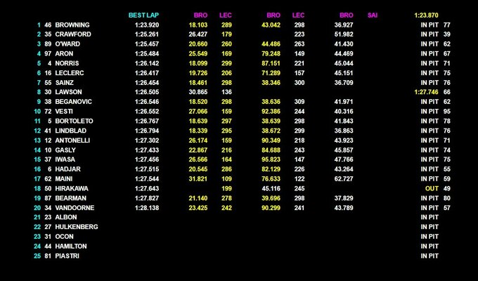На момент половины теста пять пилотов – Алекс Албон, Нико Хюлькенберг, Эстебан Окон, Льюис Хэмилтон и Оскар Пиастри – еще не показали свое время на трассе из 25 зарегистрированных гонщиков.
