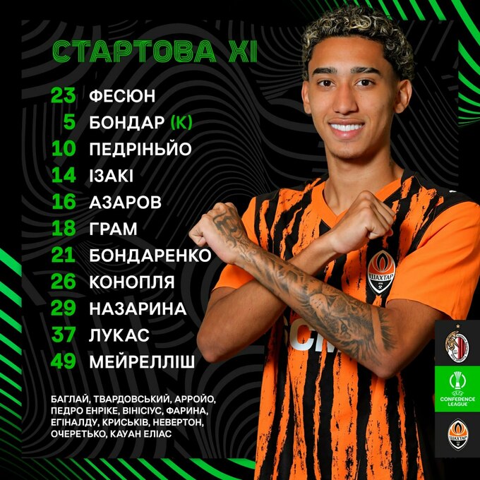 Запас: Баглай, Твардовский, Арройо, Педро Энрике, Винисиус, Фарина, Эгиналду, Крыськив, Невертон, Очеретько, Кауан Элиас