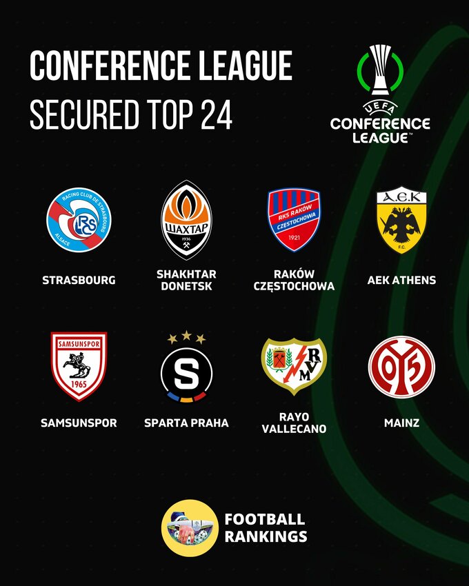 | 7 | Райо Вальекано | 5 | 3 | 1 | 1 | 10 - 7 | 18.12.25 22:00 Райо Вальекано - Дрита11.12.25 Ягеллония 1:2 Райо Вальекано27.11.25 Слован Братислава 2:1 Райо Вальекано06.11.25 Райо Вальекано 3:2 Лех23.10.25 Хеккен 2:2 Райо Вальекано02.10.25 Райо Вальекано 2:0 Шкендия | 10 | |