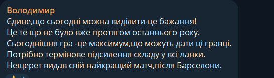 Володимир: Единственное, что сегодня можно выделить – это желание! Это то, чего не было уже за последний год. Сегодняшняя игра – это максимум, что могут дать эти игроки. Требуется срочное усиление состава во все звенья. Нещерет выдал свой лучший матч после Барселоны.