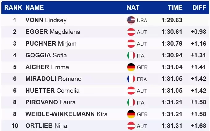 Знаменитая американка Линдси Вонн впервые за семь лет поднялась на первое место Кубка мира, завершив гонку с общим временем 1:29.63. Второй финишировала австрийка Магдалена Эггер, третьей – еще одна представительница Австрии, Мирьям Пухнер.