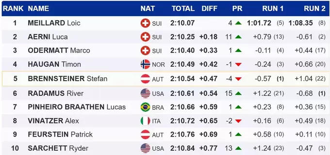 Вторым финишировал швейцарец Лука Эрни – горнолыжник поднялся на 13 позиций и завоевал свой первый подиум. Отставание от победителя составило 0,18 секунды.