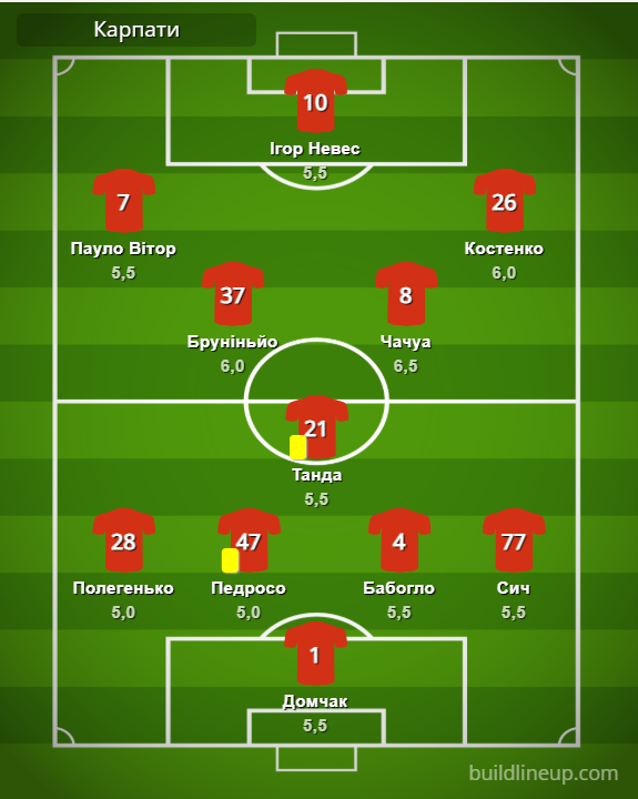 «Карпаты»: Домчак – Полегенько (Фаби, 60), Педросо, Бабогло, Сыч – Танда (Клименко, 86) – Пауло Витор (Карабин, 46), Брунинью (Шах, 86), Чачуа, Костенко – Игор Невес (Краснопир, 60).