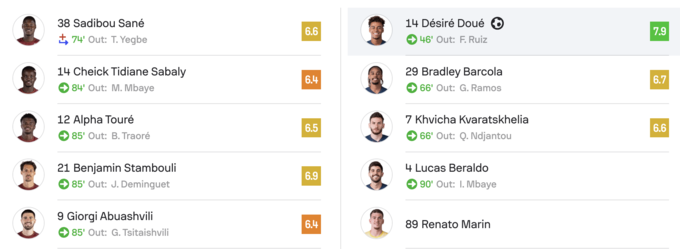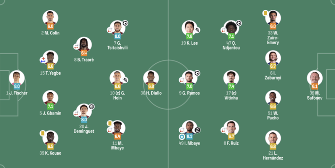Динамовец Георгий Цитаишвили получил одну из самых лучших оценок в матче 8.0, а главным героем встречи стал вингер «ПСЖ» Ибраим Мбайе – 8.1 балл от SofaScore.