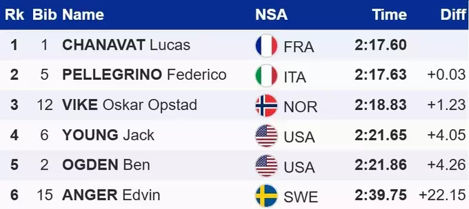 Победителем спринта свободным стилем стал француз – Люка Шанава. Вторым финишировал итальянец Федерико Пеллегрино, уступив триумфатору 0.03 секунды. Третье место занял норвежец Оскар Опстад Вике.