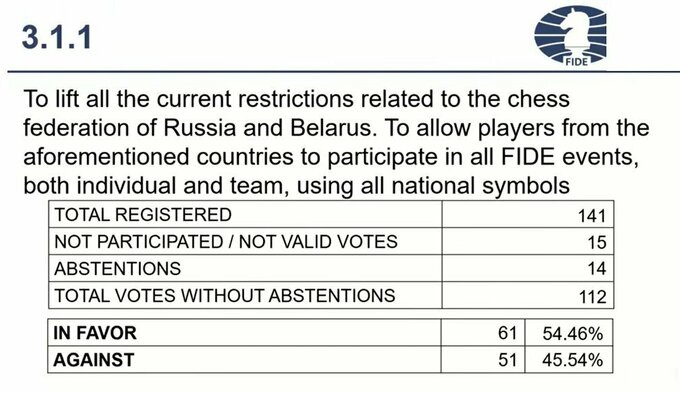 Такое решение было принято во время Генеральной ассамблеи FIDE. Делегаты проголосовали за полную отмену ограничений в отношении шахматных федераций россии и беларуси, а также за допуск игроков из этих стран ко всем турнирам FIDE (как индивидуальным, так и командным) с использованием национальных символов. Таким образом, российским и белорусским шахматистам вернули флаг и гимн.