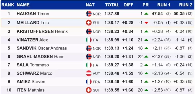 Яркий прорыв в слаломе совершил итальянец Алекс Винатцер. Спортсмен поднялся на 21 позицию и показал четвертый результат в гонке.