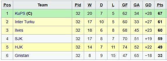 Победителем чемпионата Финляндии стал клуб КуПС, в еврокубках также будут играть Интер Турку, Ильвес и ХИК. Вылетели КТП и Хака.