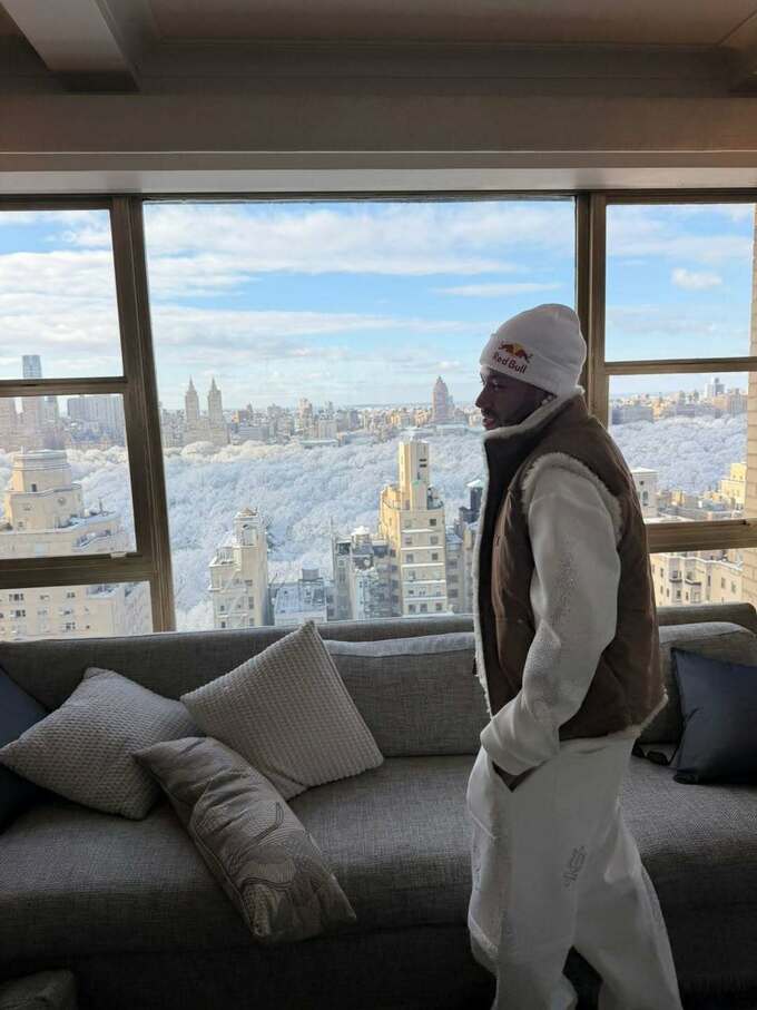 Неймар привлек внимание в Нью-Йорке, появившись на Таймс-сквер в розово-белом образе с пальто Louis Vuitton стоимостью около £4 300.