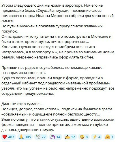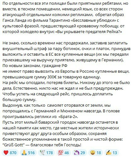 «Не знаю, сколько времени нас продержали, заставив заплатить внушительный штраф за пару ботинок, очки и платок, заставив выложить и оставить в ЕС все купленные вещи (их мы передали приятелю, который приехал на помощь и живет в Германии). По новым законам, граждане рф не имеют права вывозить из Европы в россию купленные вещи, превышающие сумму 300 евро за товарную единицу.