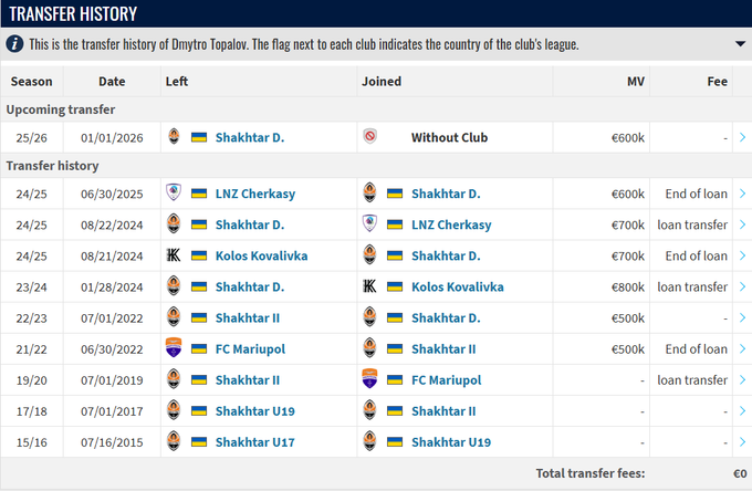 27-летний левый полузащитник «Шахтера» Дмитрий Топалов покидает донецкий клуб, информирует Transfermarkt.