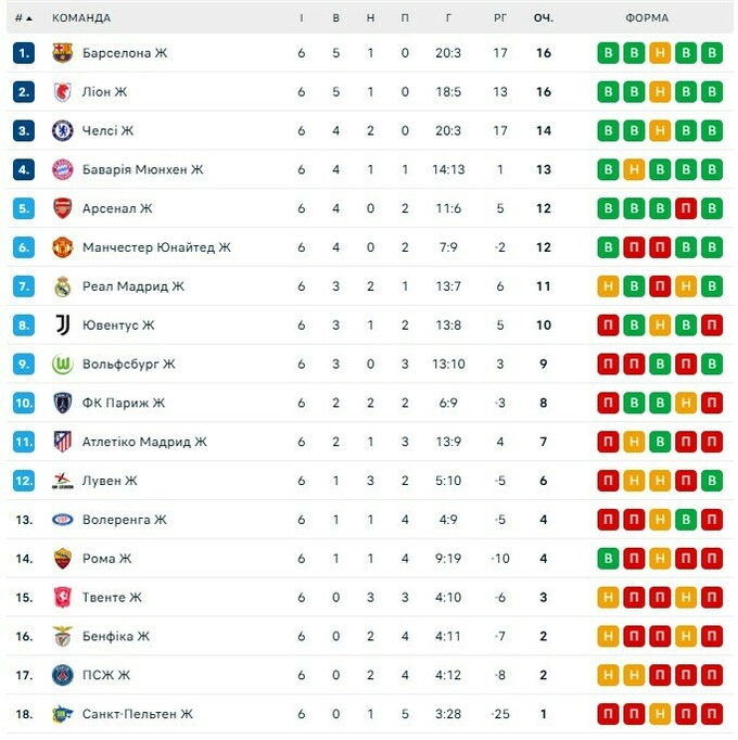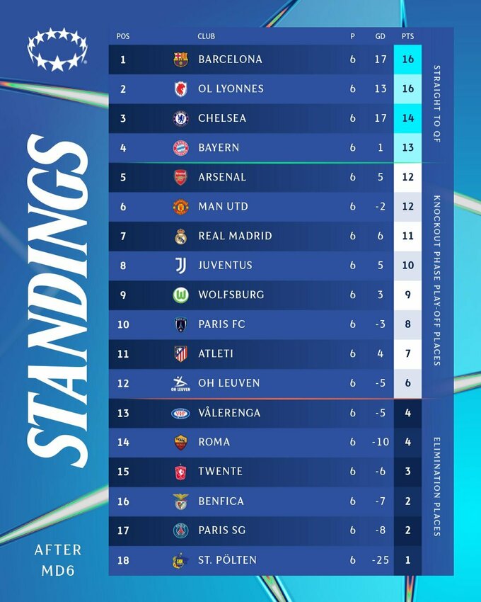 В женской ЛЧ напрямую в 1/4 финала вышли: Барселона, Лион (по 16 очков), Челси (14), Бавария (13).