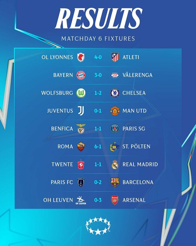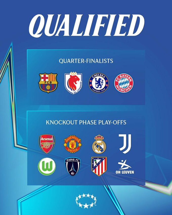 В 1/8 финала сыграют команды: Арсенал, Ман Юнайтед (по 12). Реал (11), Ювентус (10), Вольфсбург (9), Париж (8), Атлетико (7), Левен (6).