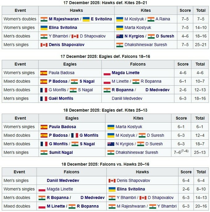 После двух туров лидером с 43 очками (43 выигранных гейма в сумме) является команда Eagles. На второй позиции идет Hawks со Свитолиной – 41. «Орлы» завтра, 19 декабря, сыграют с «Ястребами» – Элина в миксте может побороться против своего мужа Гаэля Монфиса.